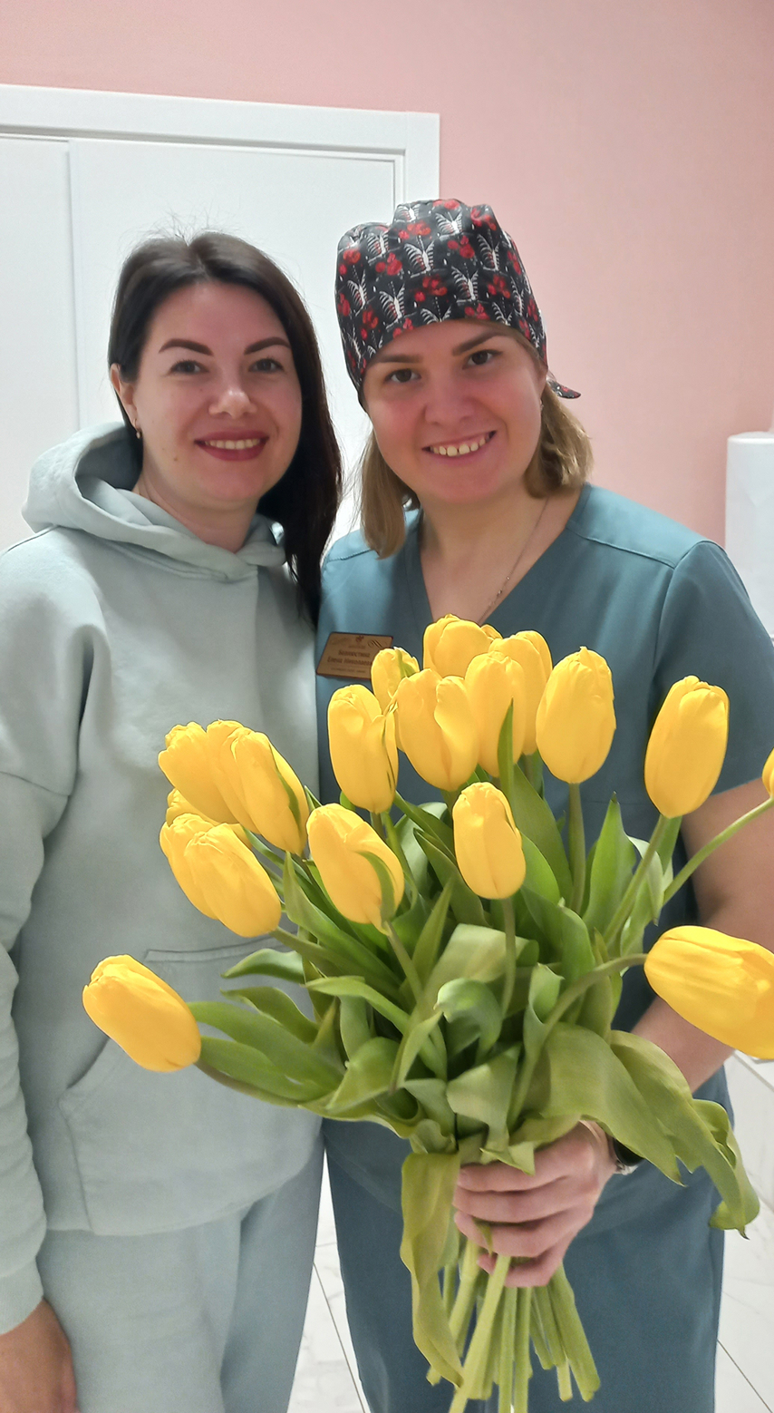 Сегодня пластический хирург Е.Н. Беллюстина получает от своей пациентки из Крыма не только слова благодарности, но и роскошный букет жёлтых тюльпанов!